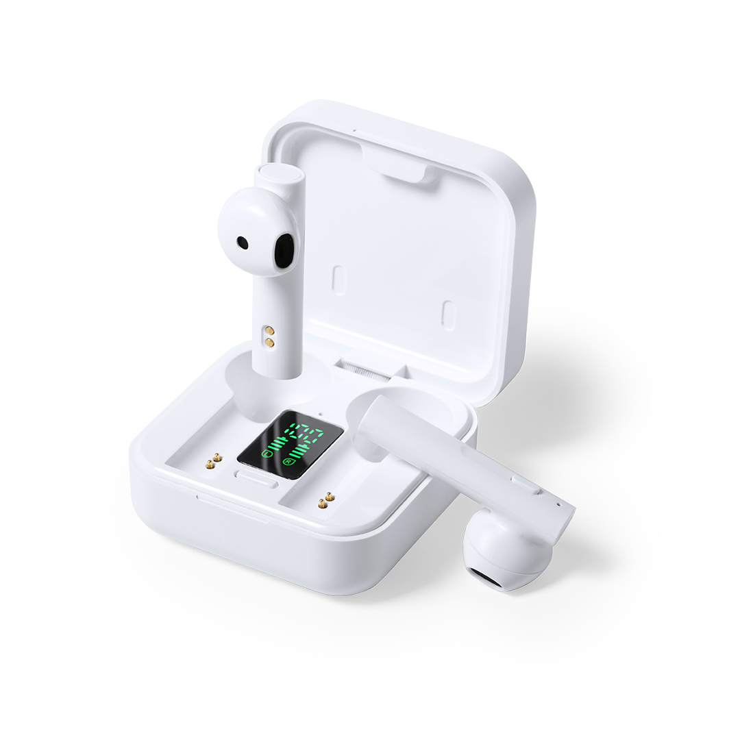 Auriculares intraurales en elegante acabado blanco y conexión Bluetooth® 5.0. Con panel de carga solar integrado en la tapa y pantalla LCD interior con indicador de estado de carga. De diseño ergonómico, incluyen botón de control integrado en el auricular, con base a juego. Función manos libres y recargables con energía solar o mediante cable micro USB -incluido-. Presentados en estuche individual premium con apertura de bisagra y en atractiva caja de diseño, con manual de instrucciones en español e inglés.