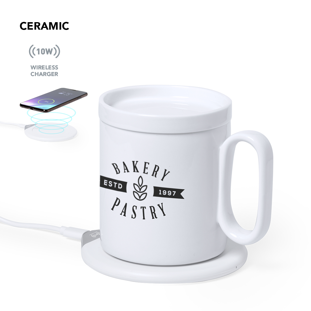Calentador de tazas con cargador inalámbrico integrado de carga rápida -10W-. Con taza de cerámica de 350 ml, especialmente diseñada para calentar y mantener la temperatura de la bebida, con tapa a juego. Incluye cargador de pared y cable de carga Tipo C. Set presentado en atractiva caja de diseño.