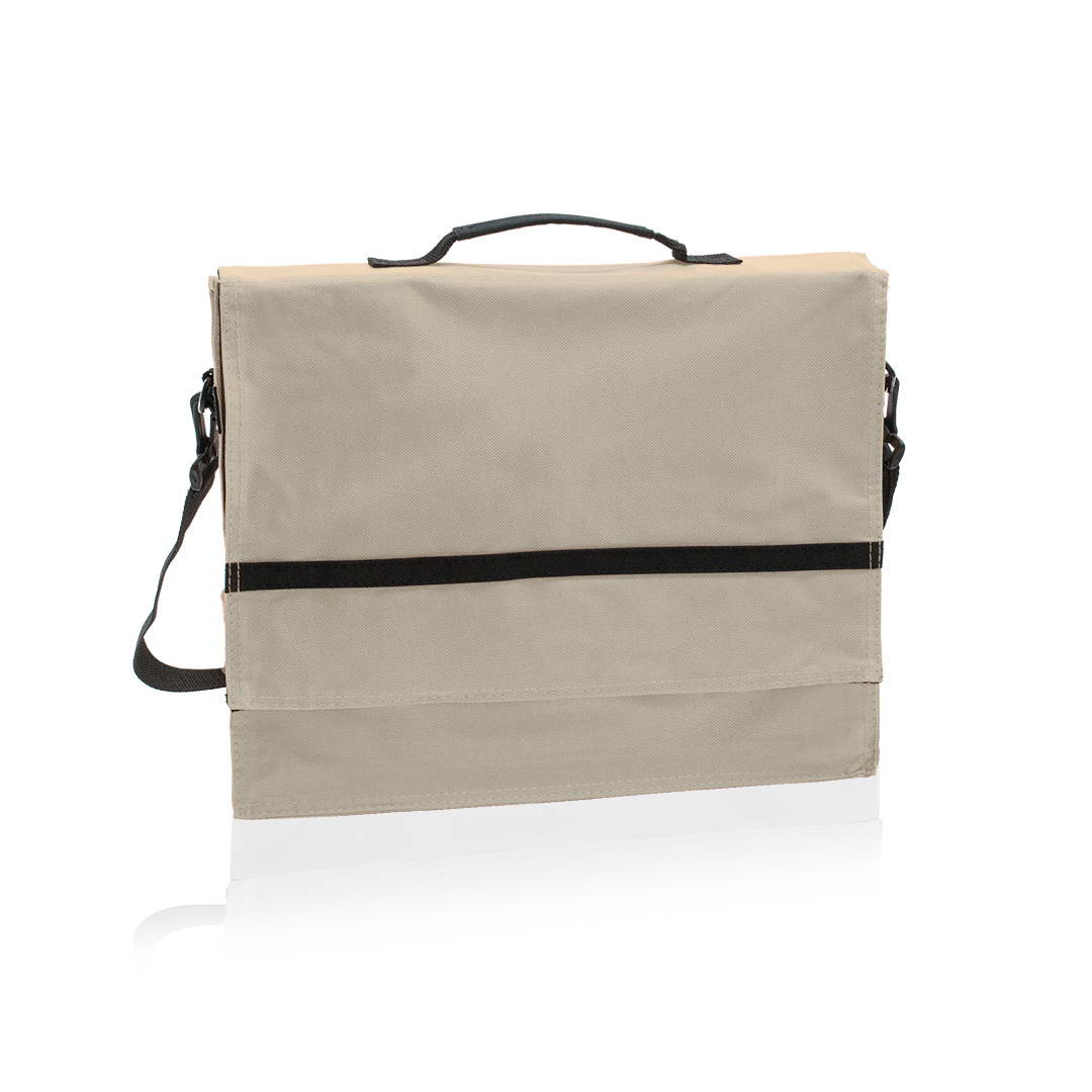 Portadocumentos en resistente poliéster 600D con tira de refuerzo en solapa y cierre de velcro. Cómoda y resistente asa de transporte, con cinta bandolera ajustable de ganchos reforzados y multibosillo interior para bolígrafos, tarjetas y smartphones. Disponible en variada gama de colores, con detalles en elegante color negro.
