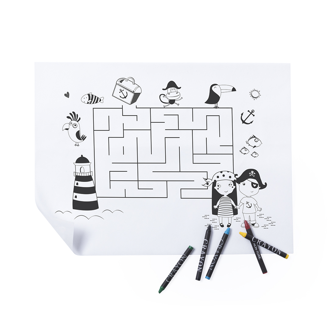 Salvamantel de non-woven en color blanco especialmente diseñado para colorear con ceras. Incluye 5 ceras de cuerpo cilíndrico en variados colores.